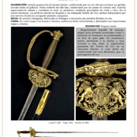 | Guard | Completely gilded brass, with straight and chiseled cross-guards. Protruding knob over a globular pommel with significant protrusions. Tapered grip, highly worked, with arms of Spain over a lion under a royal crown. Slightly lobed front shell with the emblem of the Telegraph Corps. |